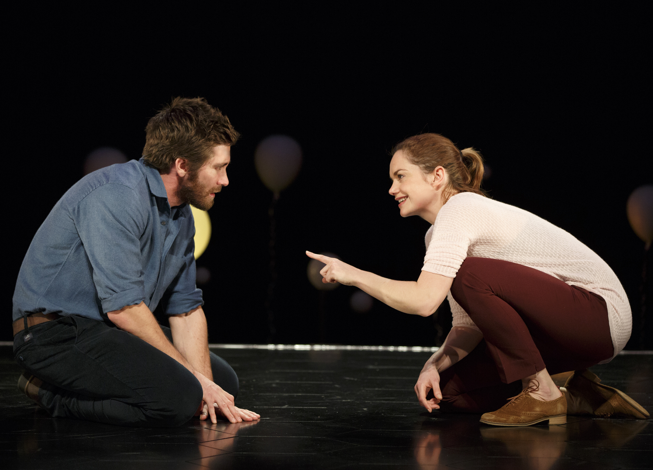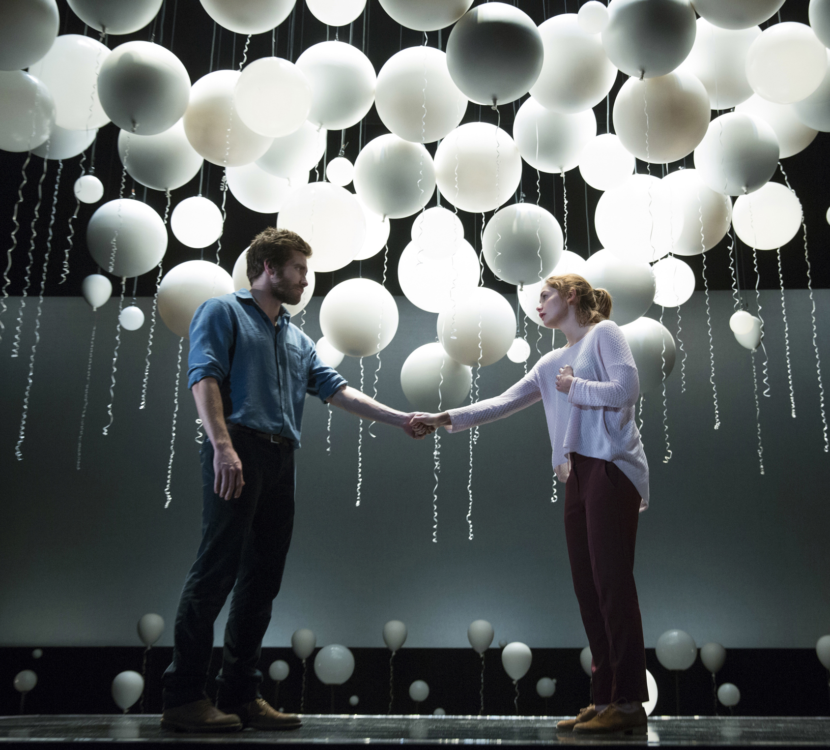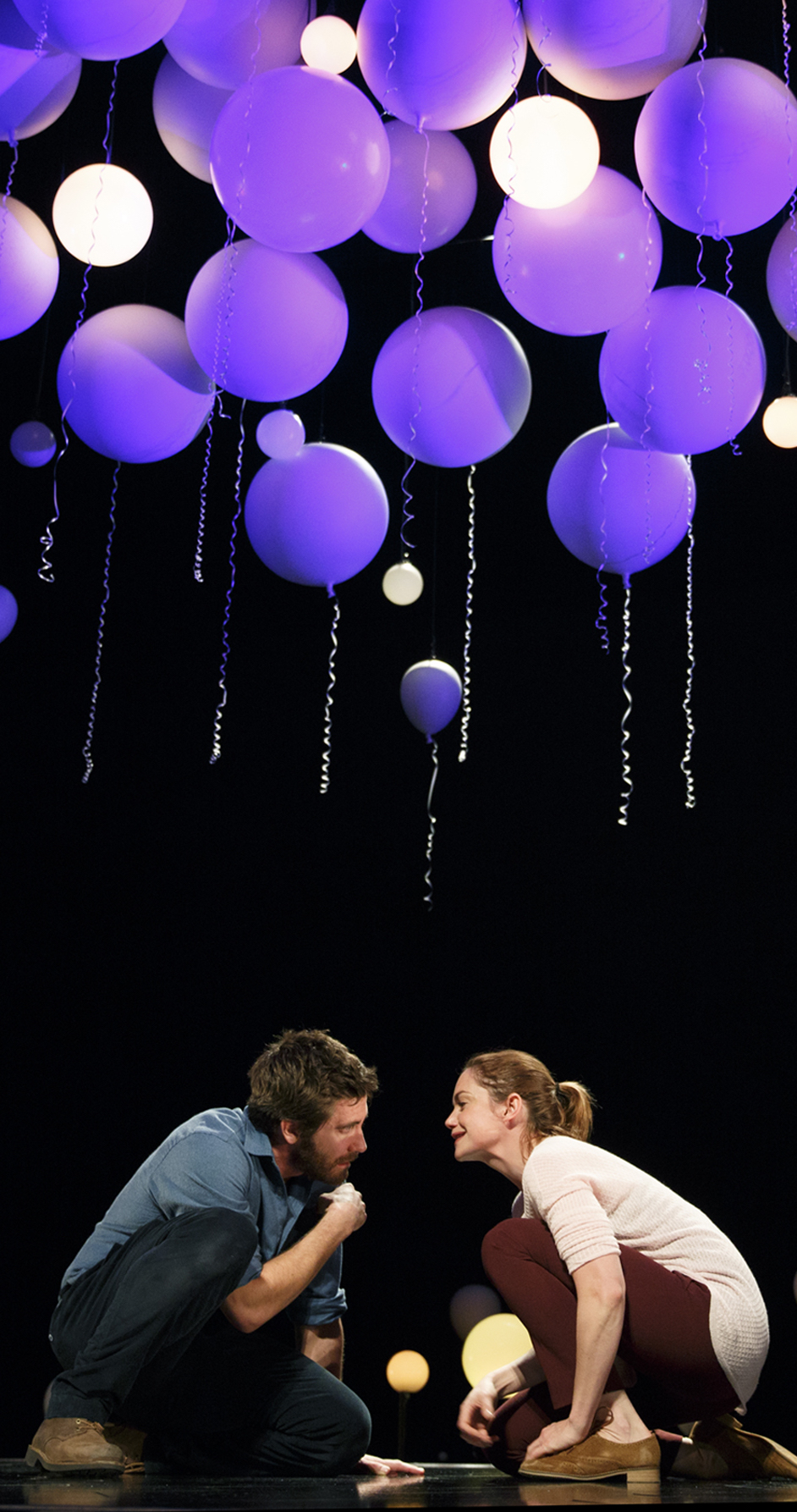 Director Michael Longhurst stages the action simply but evocatively, with the two performers circling a spare black platform, surrounded by giant balloons that change colors. (The set design is by Tom Scutt; the lighting by Lee Curran.) Those balloons prove to be anything but an accidental design element as one character complains about the “garish balloons” littering the hospital room of a dying woman with “God know how many tubes hanging out of her.” In Constellations, one of the most thought-provoking and stimulating new plays in recent memory, anything is possible but nothing is arbitrary. Grade: A