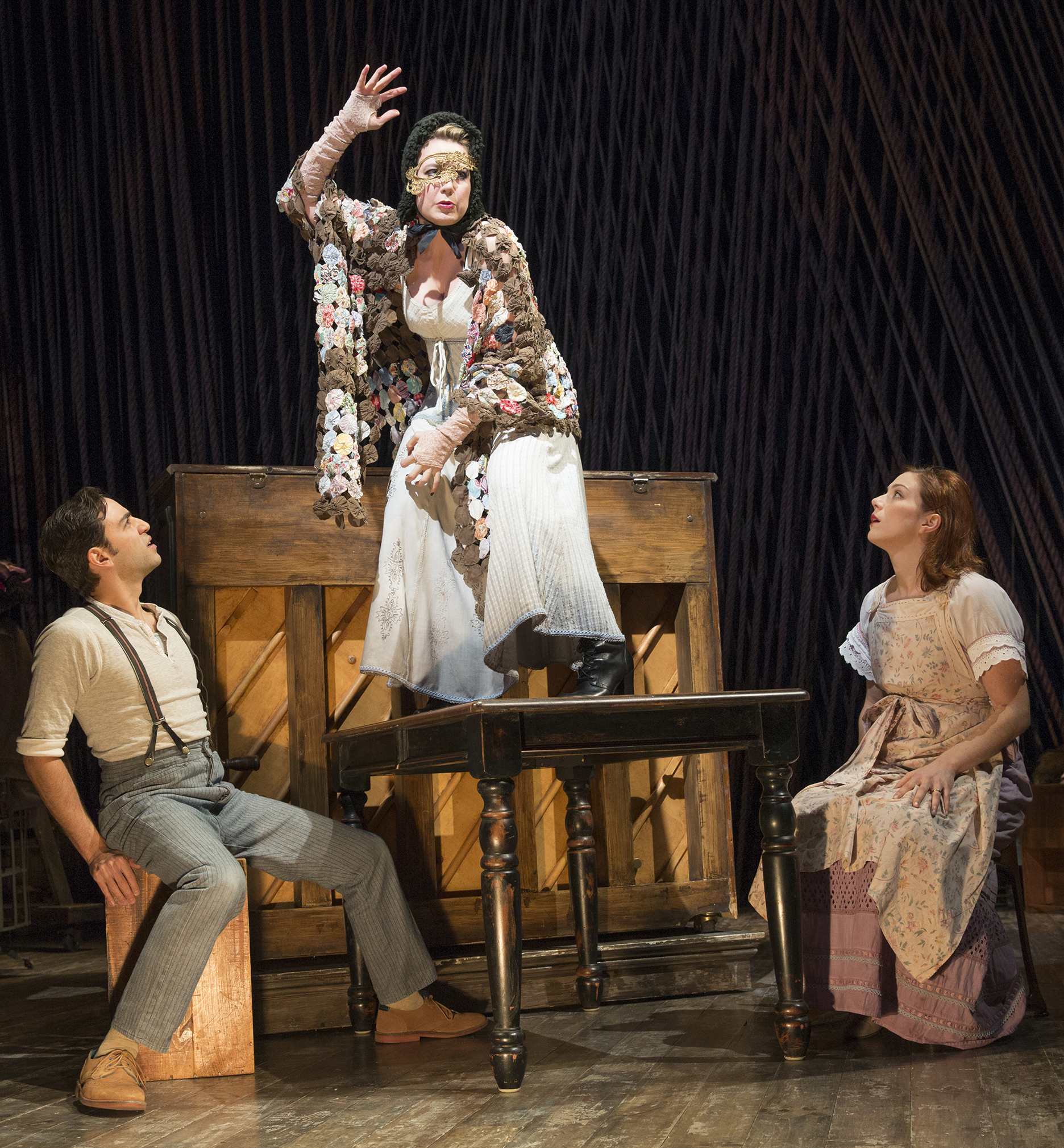 But there’s a fundamental distinction between elemental and elementary, and too often Fiasco’s Into the Woods has the look and feel of a really good collegiate or community theater production. (Perhaps it’s no accident that Fiasco’s core membership met as MFA students at Brown/Trinity Rep.) There are the simple costumes and sets, the cast who all seem roughly the same age despite a wider disparity in the seniority of their characters, the slightly uneven performances. You half expect Mickey or Judy to pop up from the wings to remind everyone, Let’s put on a show.