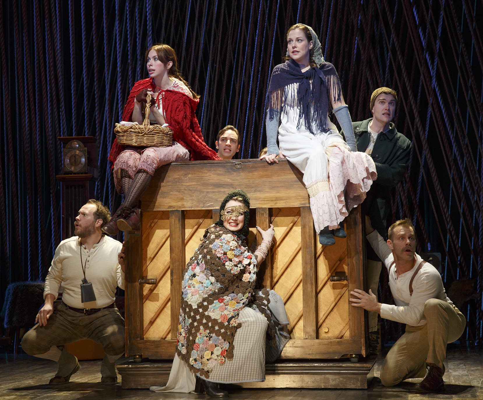 But now it seems that every young theatrical troupe wants to mount a revival according to Doyle. The latest is the innovative Fiasco Theater Company, which brings its shoestring revival of Sondheim and James Lapine’s fairy-tale mashup Into the Woods to Roundabout’s Off Broadway Laura Pels Theatre through April 12. This is Fiasco’s first musical, following widely acclaimed productions of classics like Cymbeline and Measure for Measure that relied on a similar economy of scale: minimal sets and props, and a tight-knit band of actors doubling (and tripling) roles.