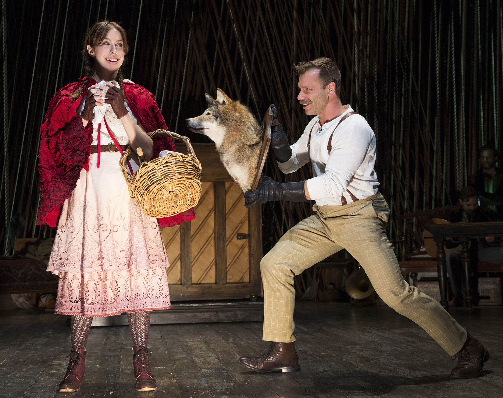 There’s much to admire in Fiasco’s 10-actor production of Into the Woods. Fiasco veteran Andy Grotelueschen, looking like a bearded Williamsburg butcher, is the best Milky White I’ve ever seen; in addition to bringing a bovine winsomeness to the wordless role of the beloved cow of Jack (of beanstalk fame), he also triples up as Rapunzel’s prince and (hilariously) as one of Cinderella’s stepsisters. Fiasco cofounders Ben Steinfeld and Jessie Austrian make fine impressions as the childless Baker and his Wife, blending in sweet-voiced harmony on the Act One duet “It Takes Two.” And there are clever touches throughout, from the mounted stuffed dog head that Noah Brody employs to play the Wolf to the shadow-puppet depiction of the Giantess.