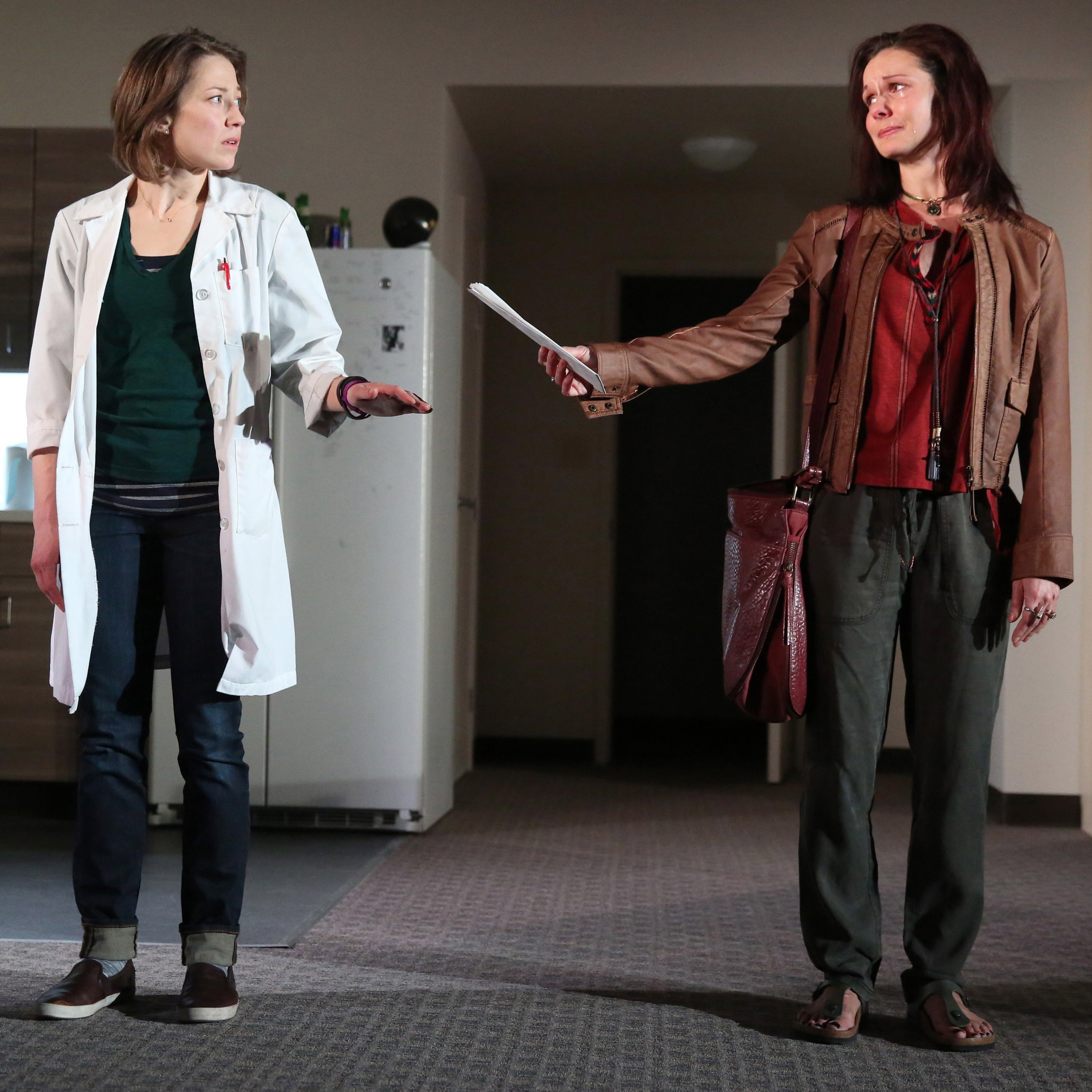 Gibson, whose credits include The Americans and several episodes of this season’s House of Cards, has a real flair for exposition, and for capturing the dynamics of relationships and the natural rhythms of dialogue. Louise turns recognizably passive aggressive about Jonathan’s nicotine habit and calls his ex “Erika with a K.” And when Louise mentions that she got a call from Susan, he asks, “Your sister Susan or Suzie Susan?” — suggesting a host of acquaintances that we never meet but that ground us in a real couple’s back and forth. Gibson also creates set pieces that verge on the believably absurd, including a vending-machine relay race between Louise and her flirtatious fellow lab tech, Tom. Alex Hurt, who appeared in Classic Stage’s 2013 revival of The Caucasian Chalk Circle, shares his father William’s relaxed, intellectual bearing as Tom.