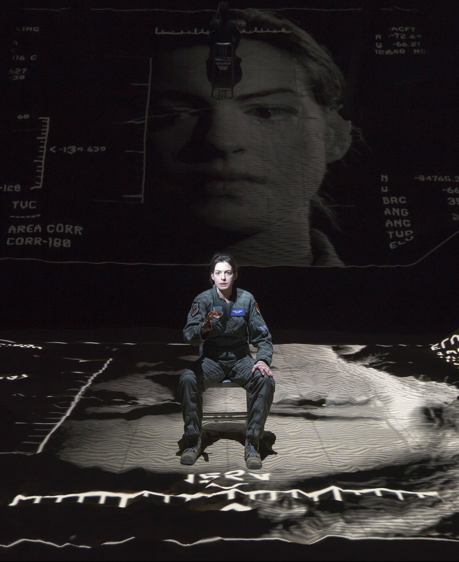 I never understood the antipathy that some people seem to have for Anne Hathaway. She’s strikingly beautiful, of course, but in a way that is not supermodel offputting. She radiates an easy self-assurance that I suppose can come across as haughty, but her strongest performances reveal flashes of genuine vulnerability, as in her Oscar-winning role as Fantine in Les Misérables. She’s also insanely talented, as she proves in her commanding solo turn in George Brant’s ripped-from-last-week’s-headlines topical drama Grounded, playing through May 24 at the Public Theater. It’s a star-making performance in a challenging role that leaves her nowhere to hide — and with no one to fall back on for support.
