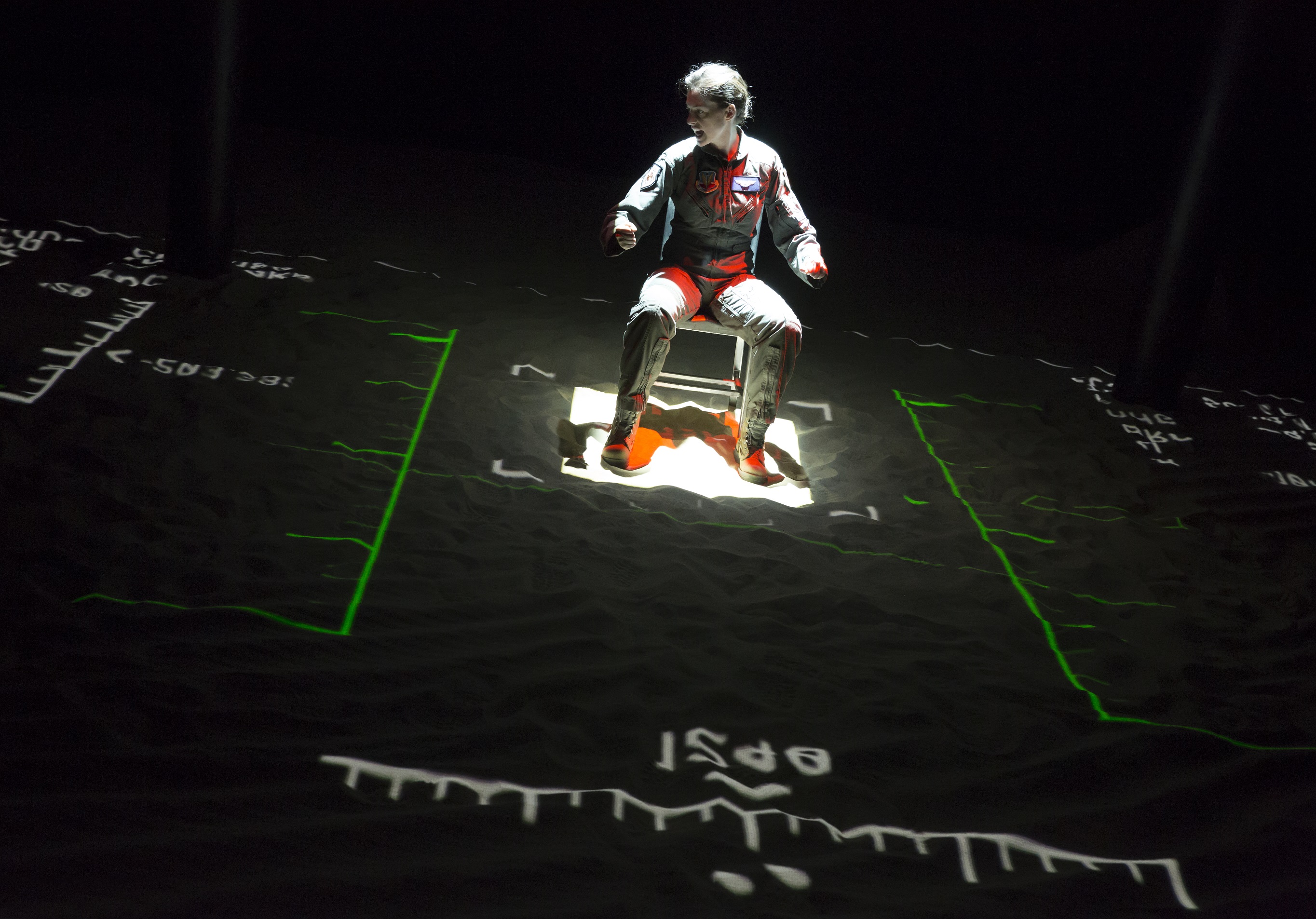 And what a physical production it is. Credit goes to Julie Taymor, directing her first Public Theater production, and her design team — particularly Peter Nigrini, whose eye-popping videos simulate everything from desert sands to surveillance images of combat to the Las Vegas strip, all while underscoring the videogame-playing quality of this pilot’s wartime experience. These images are projected onto Riccardo Hernandez’s simple but memorable set, a stage of raked sand with an slanted upstage mirrored wall that reflects the projections in fascinating, dynamic ways. The staging reinforces the central paradox of Grounded, that modern warfare can seem the stuff of videogames and artifice as well as viscerally and inescapably real. Grade: B+