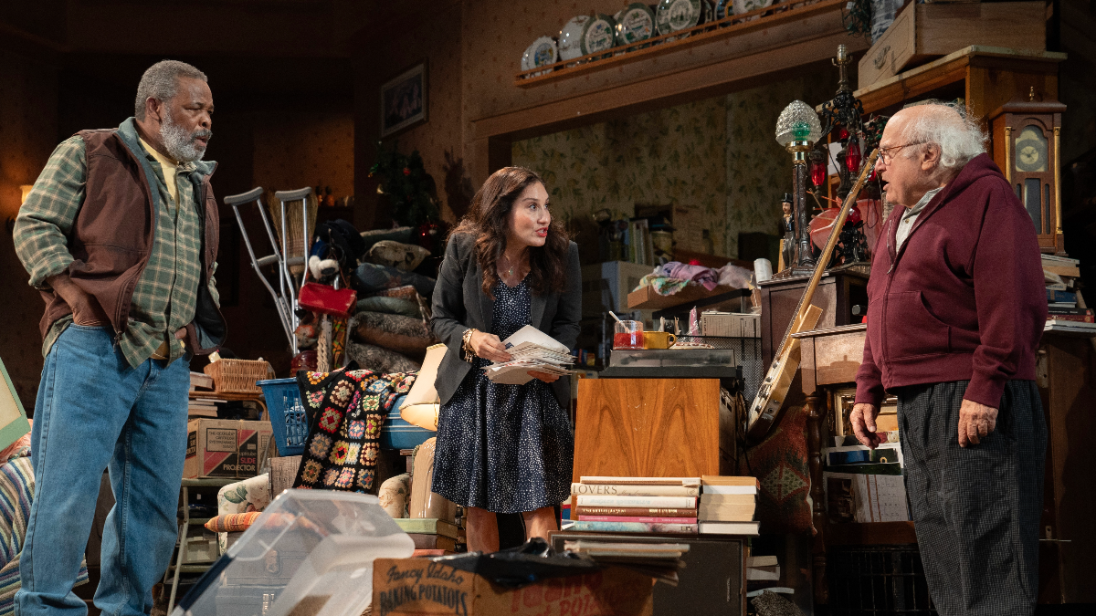 Danny DeVito stars as a crotchety retiree who’s retreated like a hermit into his suburban New Jersey house with all the stuff he accumulated during his marriage to his late wife. He’s a borderline hoarder and his living room (wonderfully designed by Alexander Dodge) is piled high with the detritus of life: board games, books, suitcases, a broken TV, an unplayed electric guitar, display plates, etc. There’s only one place for him to sit: an armchair with a crocheted throw over it. While the neighbors have called the authorities and a fire inspector visit is imminent (partly because he refuses to go outside and the lawn is an overgrown mess), Sam maintains that his messy home is not a health hazard to himself or to others. “My kitchen is spotless, why doesn’t that count?” he tells his pal, Foster (Ray Anthony Thomas). “I have a lot of dishes in there, that’s true, but they’re all clean.”