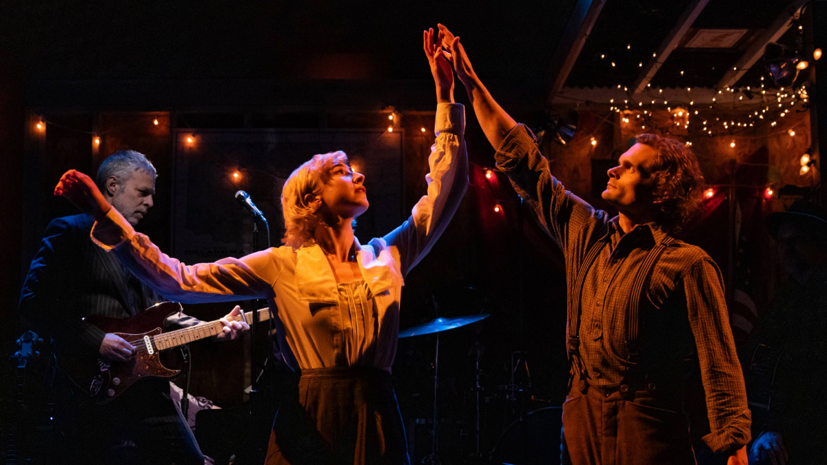 Yazbek, whose previous musicals have mostly been adaptations of movies like Dirty Rotten Scoundrels, Women on the Verge of a Nervous Breakdown, The Band’s Visit, and (most recently) Tootsie, seems liberated by the looseness and oddity of the material to produce a melodically infectious score that’s grounded in the roots-music traditions of country-folk, rockabilly and the blues — wonderfully performed by a five-piece band (led by pianist and music director Rebekah Bruce) that employs banjo and lap steel guitar to achieve its wonderful sound. (Jeb Brown, who narrates the tale, also pitches in on guitar.)