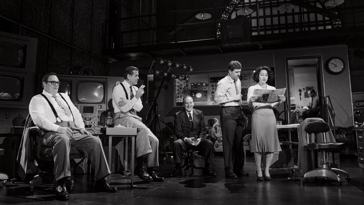 Clooney ably delivers the show’s central message in a speech that bookends the show. “We are currently fat, comfortable, and complacent,” he proclaims from a podium, an address Murrow actually delivered at an industry event five years after his ground-breaking McCarthy broadcast. “Unless we get up off of our fat assets and recognize that media, in the main, is being used to distract, delude, amuse, and insulate us, then those who finance it, those who profit from it, those who work at it and those who consume it may see a totally different picture too late.” It’s a call to arms for both media workers and consumers that still holds in its prescient urgency — and it’s goosed by a video montage that takes us from Murrow’s era right up to the present Elon Musk-shadowed moment. That message still comes through loud and clear in Clooney’s 2005 film. All too often, the stage version feels like a noble but unnecessary repeat. ★★☆☆☆
