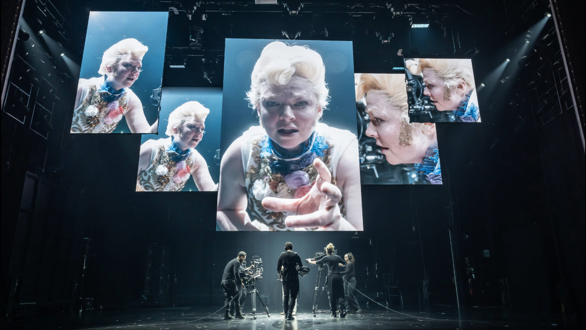 That scene is staged far upstage, where many audience members at the Music Box Theatre may not even be able to see. And therein lies the secret of this production. Our appreciation of Snook’s performance depends in large part on the cadre of five Stedicam-wielding camera operators who surround her throughout the performance — and enable her image to be projected live on the giant horizontal screen dangling from the center of the stage, as well as on smaller screens that shift about the performing space to create a series of cinematic tableaux that sometimes create a widescreen Cinerama effect and other times allow a glorified Zoom meeting with competing voices (and faces).