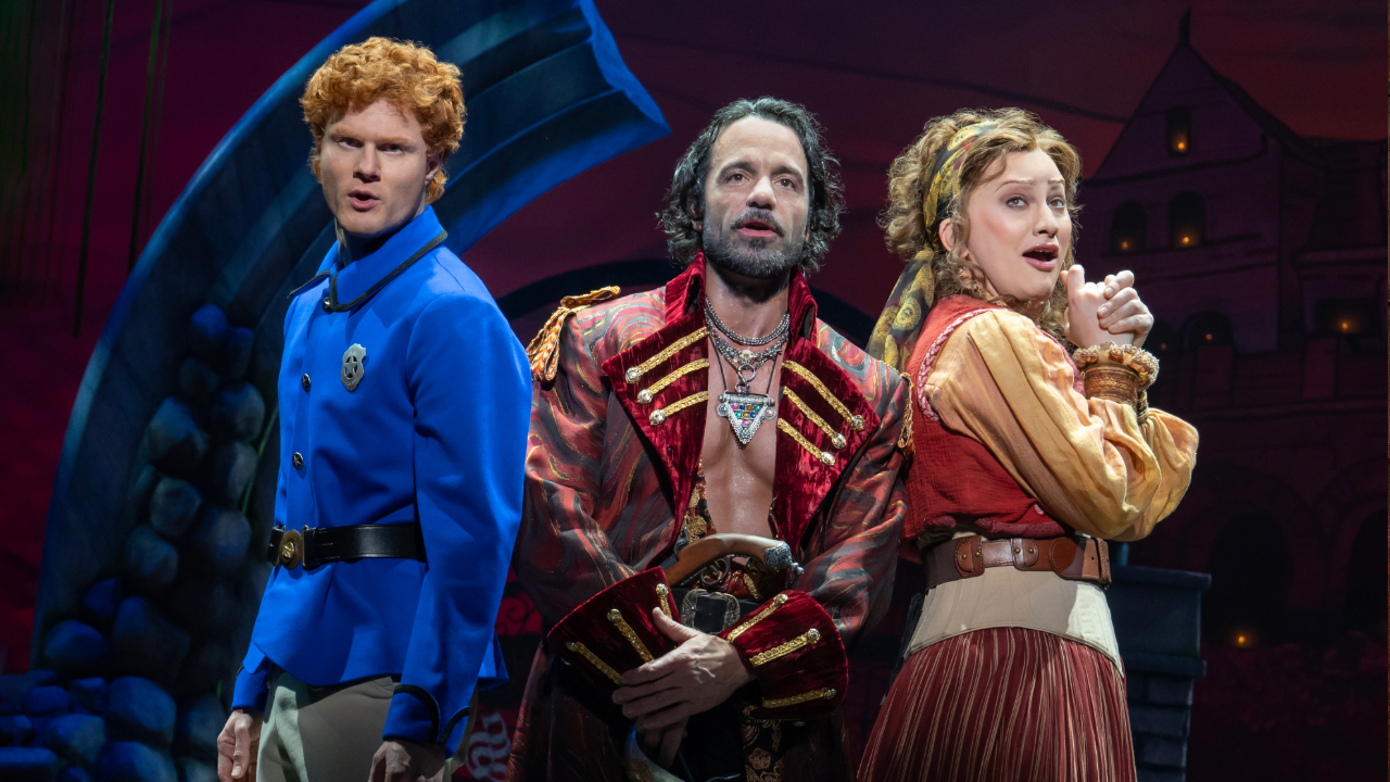 There’s a colorful cartoonishness to the whole endeavor, from David Rockwell’s storybook sets to Cho’s boldly patterned costumes to Donald Holder’s lighting, that underscores the ridiculousness of the story. After all, this is a show whose plot centers on a series of punny misunderstandings of words (pirate and pilot, orphan and often) from characters who seem blissfully unaware of their innate silliness. Happily, Ellis’s cast leans into the absurdities without going too meta. As broad as the performances go, and they go very broad indeed, it’s clear that none of the characters are in on the joke. And that makes it all the more fun to watch.