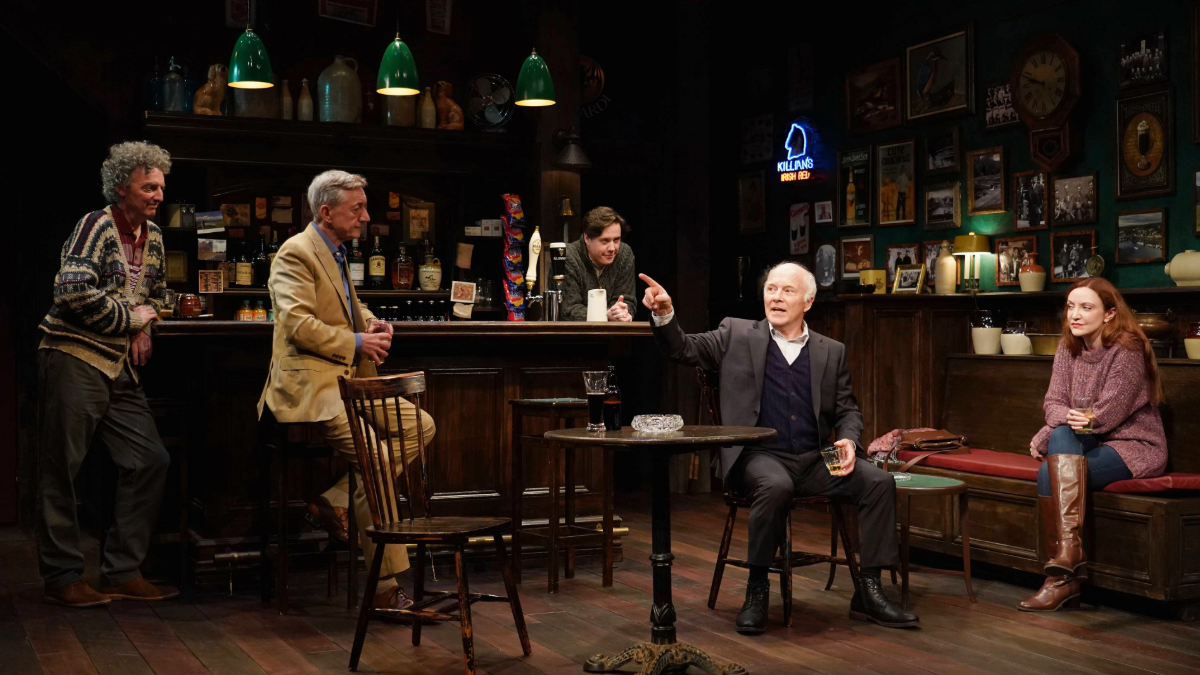 The setting is a remote Irish pub (designed by Charlie Corcoran and dimly lit by Michael Gottlieb), where five people gather on an evening so blustery that the howl of the wind rises whenever the door is opened (sound design by Drew Levy). They come to drink, to take a break from a long day’s work, to stave off the loneliness of living in such an isolated location. But they also gather around the tavern’s metal-stove hearth to swap tales, mostly of a supernatural bent. There are fairy roads and freshly dug graves and ghostly knocks at the window panes.