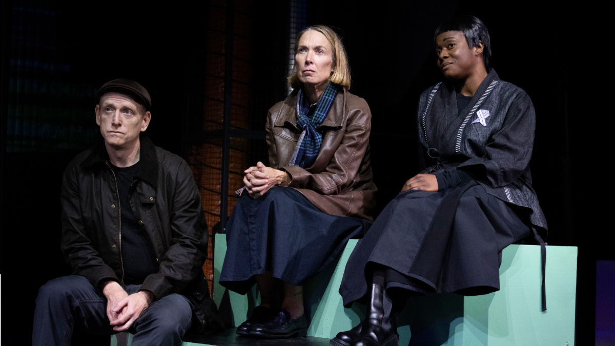 All of these philosophical debates benefit from the evocative physical production, beginning with David Meyer’s lo-fi sci-fi set design, with its bright orange tubes and movable Erector-set-like rectangular columns, as well as Marina Graghici’s monochromatic near-future costumes, Reza Behjat’s lighting, and especially the sound and original music from Henry Nelson and Will Curry. (In one of the show’s funniest moments, as the parties in the trial enter a sidebar discussion about whether Marvel’s lawyer should be allowed to utter the name of the prisoner during the proceedings, the stage goes dark and we hear bouncy hold music for close to a minute until the trial resumes.)
