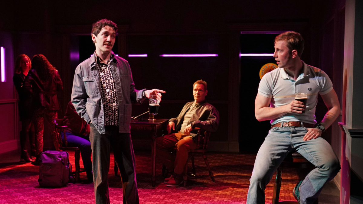 Even decades later, Dave seems haunted by the killing — which we see unfold in flashbacks that erupt around the interview table on Charlie Corocran’s simple but stylized set. In director Matt Torney’s staging, Hayden’s Dave looks on as both narrator and observer to his actions as a young corporal (where he’s played by Daniel Marconi). While he puts up a combative front, provoking his supposedly impassive interviewer with personal questions and needling her about her politics, Dave also exudes unresolved emotions about his role in Northern Ireland. He regrets luring his reluctant, happily married pal, Bobby (Harrison Tipping, slightly overplaying the wide-eyed innocent), into a situation where he was persuaded to go home with some pretty locals they had just met over beers and vodka-tonics (Doireann Mac Mahon and Annabelle Zasowski). He also harbors survivor’s guilt since he sent sweet-faced Bobby into a trap all alone; he himself got cold feet after a phone call home to his wife and didn’t join the extramarital shenanigans.