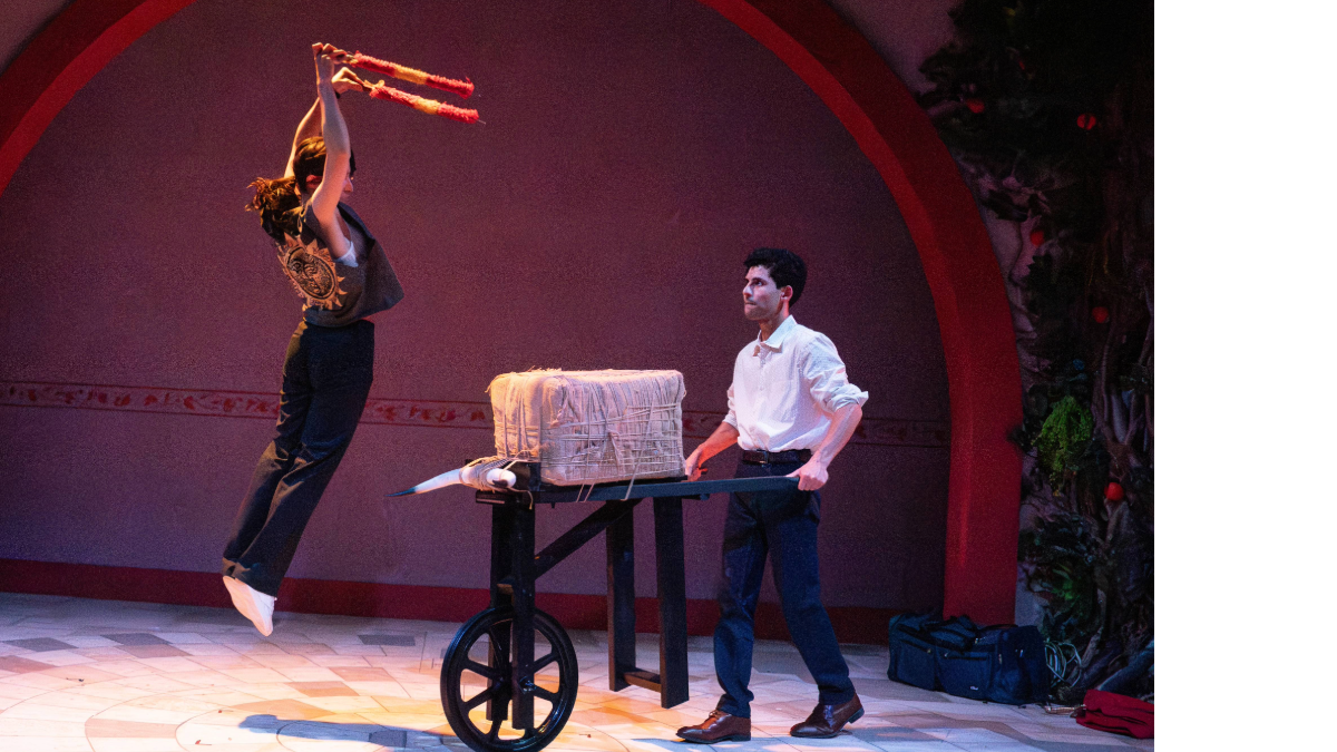 Director Tatiana Pandiani’s production rushes us through the beats of the story at such an athletic pace that you may miss some of the more glaring lapses in logic and motivation. She also incorporates and choreographs two remarkable dancers, Christian Jesús Galvis and Andrea Soto, who pasa doble across the stage between scenes. They move furniture and props, establish a sensual ambience and signal flashbacks and flash-forwards by parading across the stage with a capote cape marked “the past” or “the future,” and memorably embody charging bulls as well as a horse that Tanok rides in training, climbing onto and off of Galvis’ shoulders.