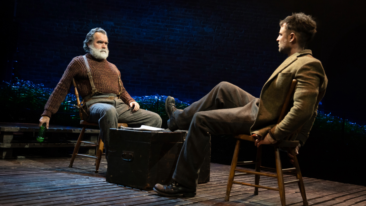 Kail and his design team have crafted a handsome production, with sturdy seamen shifting and stacking weathered wooden pallets around the stage between scenes and a giant steel beam first used as a saloon bar and then hoisted aloft to hover over the action like a ship’s mast or a giant sword of Damocles. (Christine Jones and Brett J. Banakis are credited with the scenography, with Natasha Katz’s lighting amid the occasional onset of fog by special effects designer Jeremy Chernick.) But the attempts at symbolism seem strained for a play as straightforward and muted as this one — where the characters manage to avoid the ravages of alcoholism or shipwreck or even death by gunshot despite the appearance of a pistol late in the show.